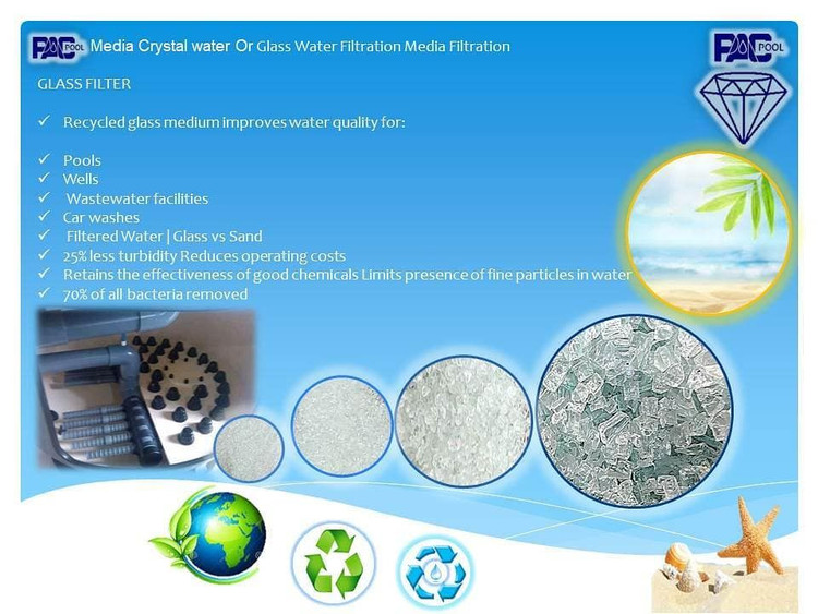 شیشه خرد شده (کریستال مدیا ) به طور گستردهای نسبت به سیلیس ماسهای به عنوان مدیا فیلتر تصفیه آب برای استخرهای شنا و تصفیه خانه فاضلاب مورد استقبال گسترده قرار گرفته است. شیشه خرد شده دارای برخی از ویژگی های غیر معمول است که به ویژه به خوبی به فیلتراسیون کمک میکند.
