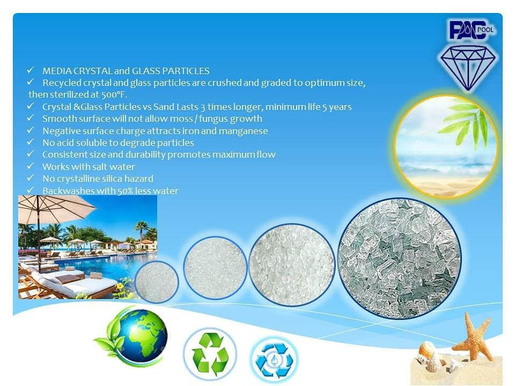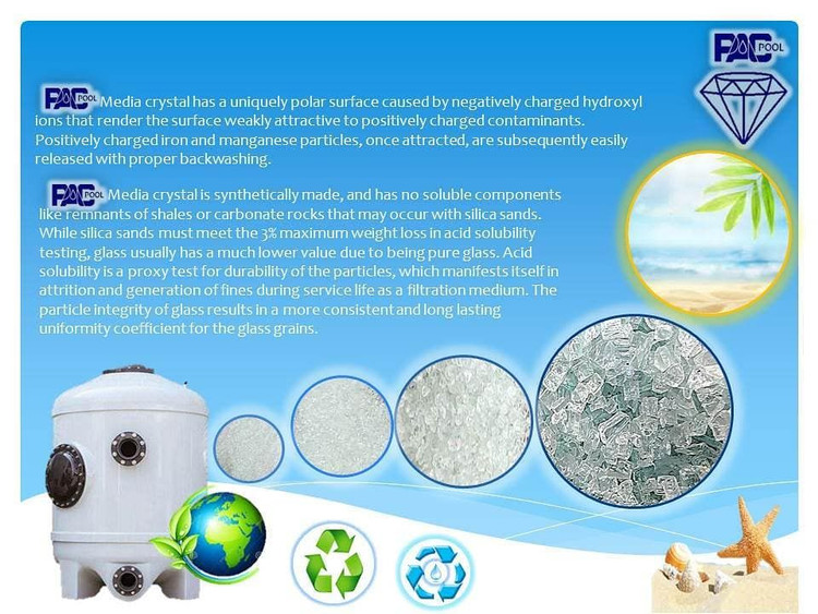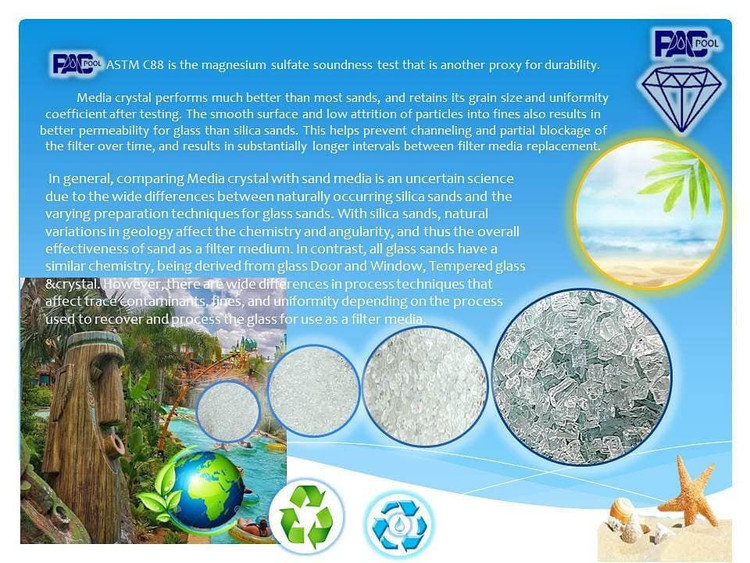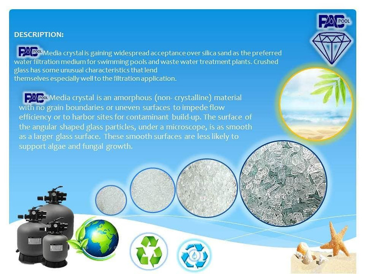 شیشه خرد شده (کریستال مدیا ) به طور گستردهای نسبت به سیلیس ماسهای به عنوان مدیا فیلتر تصفیه آب برای استخرهای شنا و تصفیه خانه فاضلاب مورد استقبال گسترده قرار گرفته است. شیشه خرد شده دارای برخی از ویژگی های غیر معمول است که به ویژه به خوبی به فیلتراسیون کمک میکند.